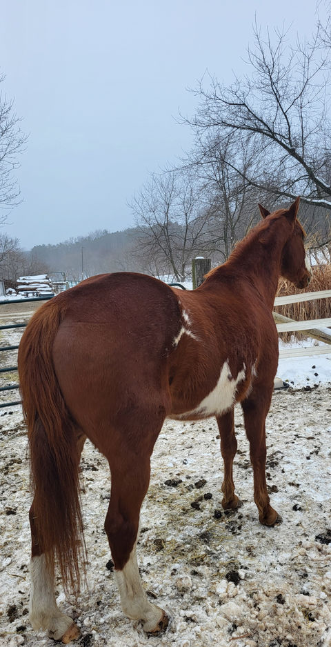 Sarge is a senior gelding who was surrendered because his owners moved and they were unable to take him with them. He was very thin when he came as he had been blanketed over the winter and had not been checked. After taking him to the vet it was found that his back teeth were so worn that he could not chew the hay/grass sufficiently to be able to swallow it and would just drop it. He was put on a three-a-day mash diet and is now at an appropriate weight. He is very friendly, loves attention, and works in our Skills Development Programs.